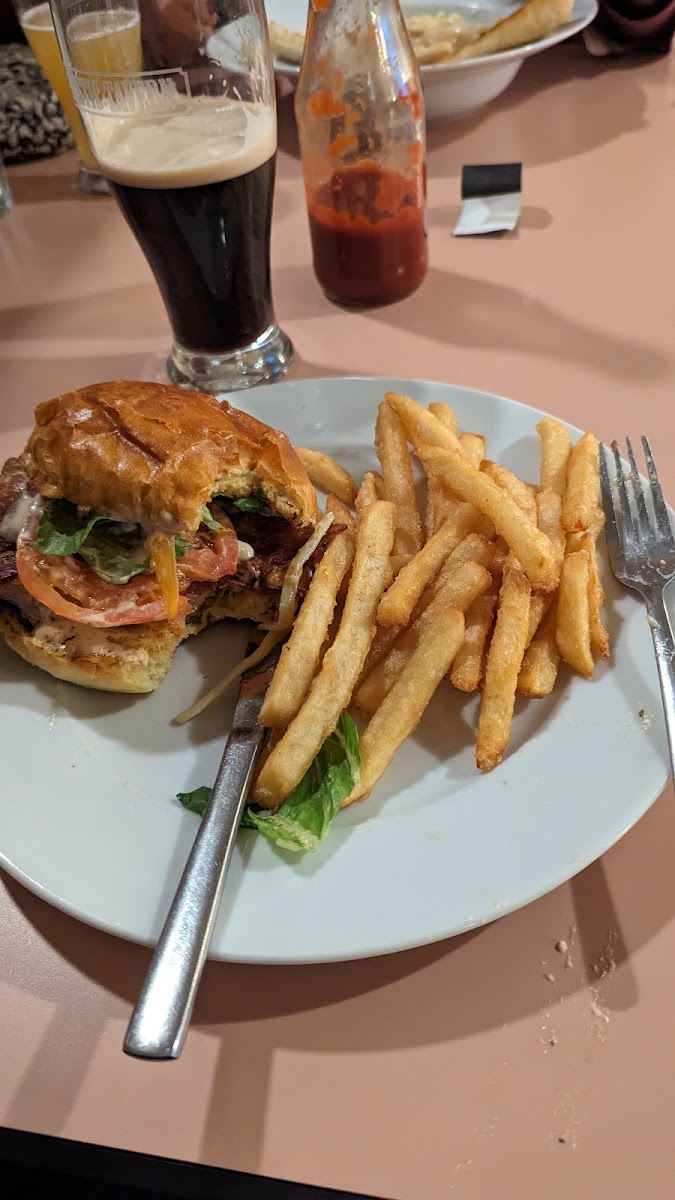 Another coworker recommendation to try the Rustic Tavern and it did not disappoint. The building is larger than it seems with a bar area at the rear. I recommend the Chipotle Ranch Chicken Burger! The homemade chipotle ranch was so good I had it as my salad dressing. The chicken was perfectly cooked and juicy. Two full pieces of bacon, lettuce and tomato top it all off between a toasted brioche bun. The prices were very reasonable, our waters were always full and the staff were friendly. I will definitely be back.